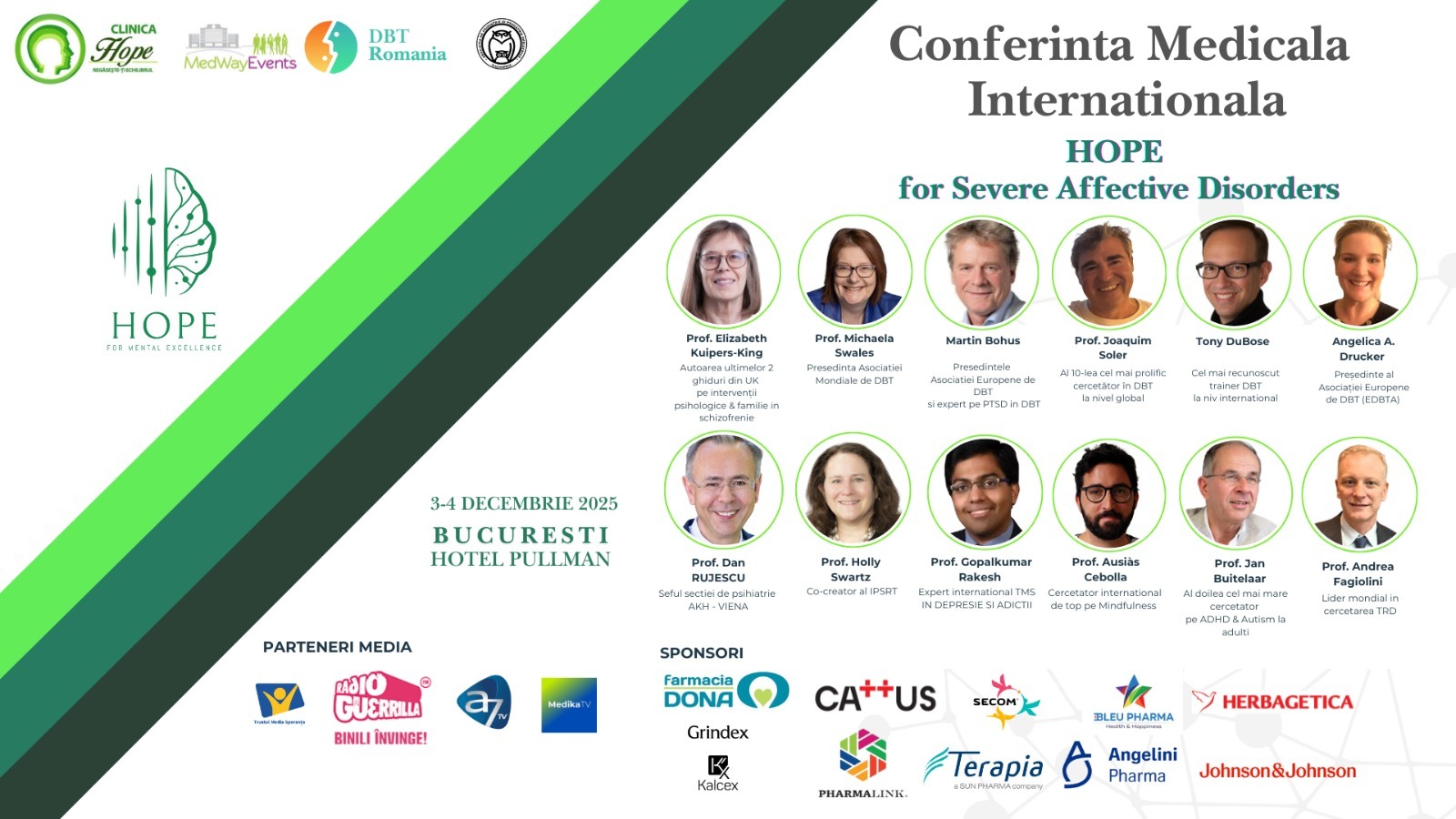 Conferința internațională “Hope for Severe and Affective Disorders” aduce, pentru prima dată în România, 11 lideri mondiali în tratamentul depresiei rezistente la tratament, tulburării bipolare, schizofreniei, ADHD-ului, autismului la adult și tulburărilor de personalitate.