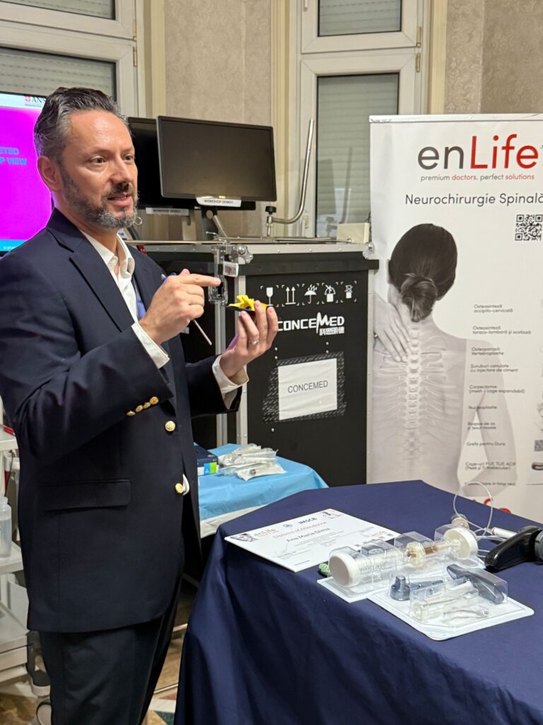 „Stabilizarea unei vertebre fracturate prin vertebroplastie sau cifoplastie poate preveni ani de dureri de spate și deteriorare progresivă”, a explicat Dr. Ștefan Mindea în cadrul demonstrației practice.